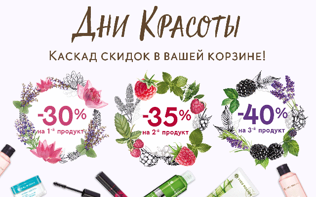 Предложение «Каскад скидок» действительно до 9 сентября 2019 г. в интернет-бутике Yves Rocher.