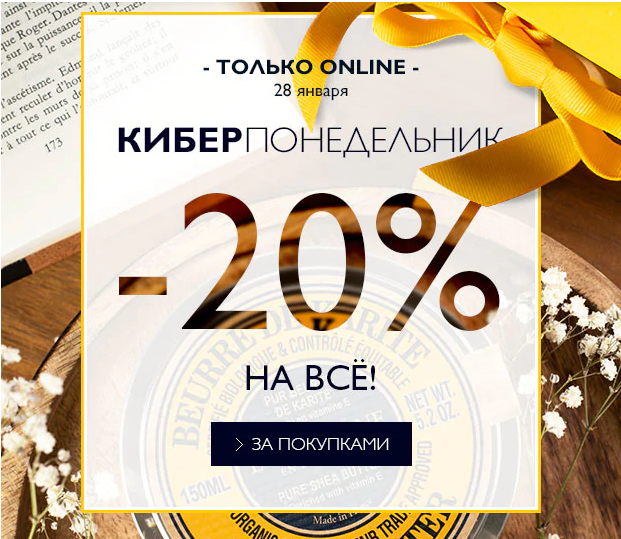 Условия акции: скидка -20% действует на весь ассортимент в интернет-магазине L'Occitane.Действие акции: только 28.01.2019 до 23:59 по моск.времени.