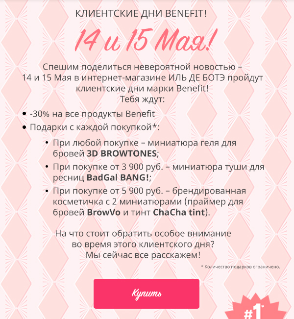 Условия акции: скидка -30% предоставляется на продукцию бренда Benefit в интернет-магазине Иль де Ботэ.