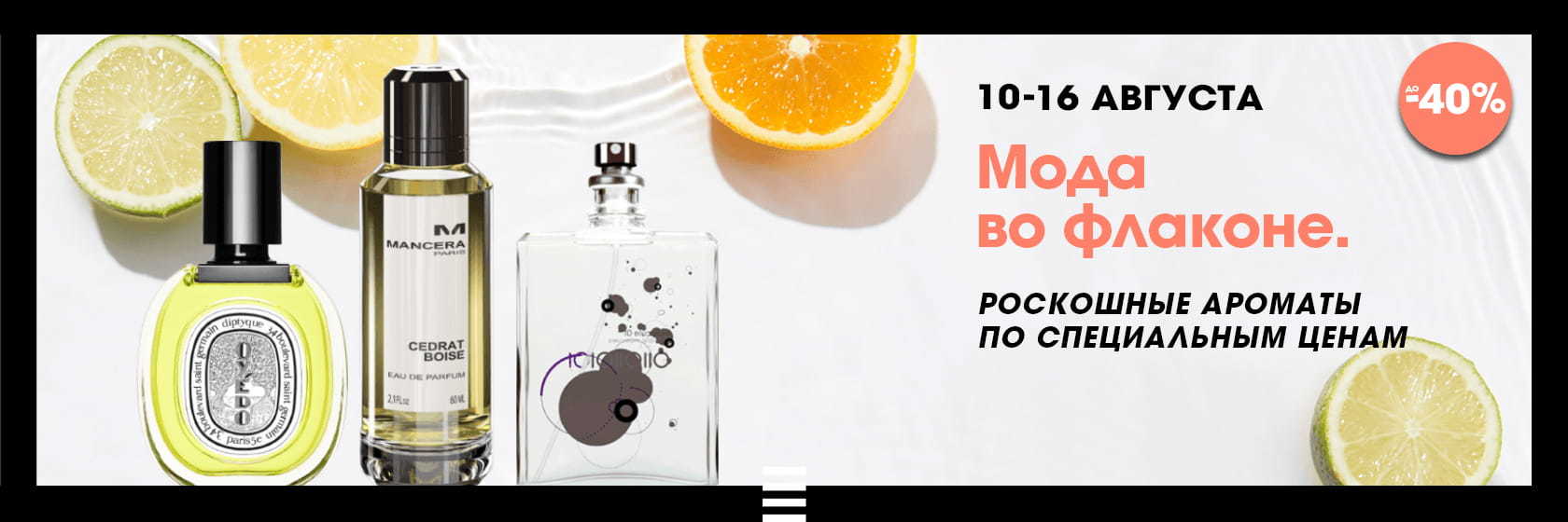 419 0 Условия акции: нишевая парфюмерия по специальным ценам при покупке в интернет-магазине SEPHORA. Действие акции: с 10.08.2020 по 16.08.2020Перейти к покупке! 12.08.2020 Автор статьи: Мария Владимирова Поделиться с друзьями