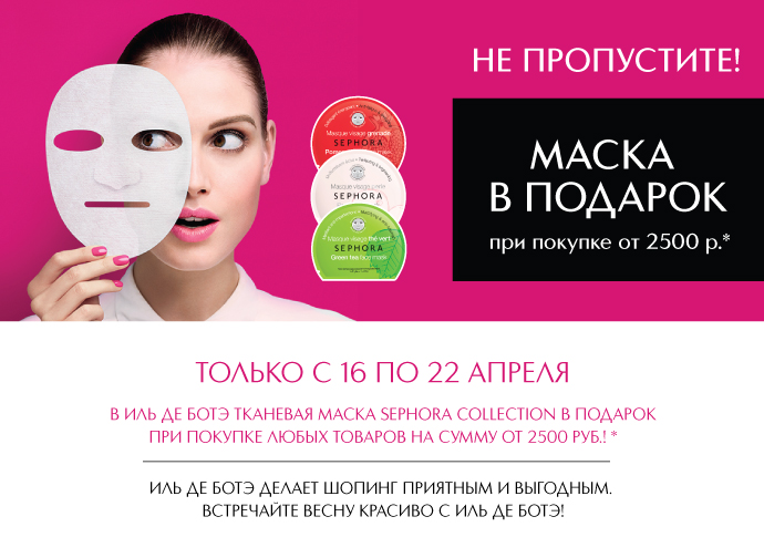 Только с 16.04.2018 по 22.04.2018. в ИЛЬ ДЕ БОТЭ тканевая маска Sephora Collection в подарок при покупке любых товаров на сумму от 2500 руб.!