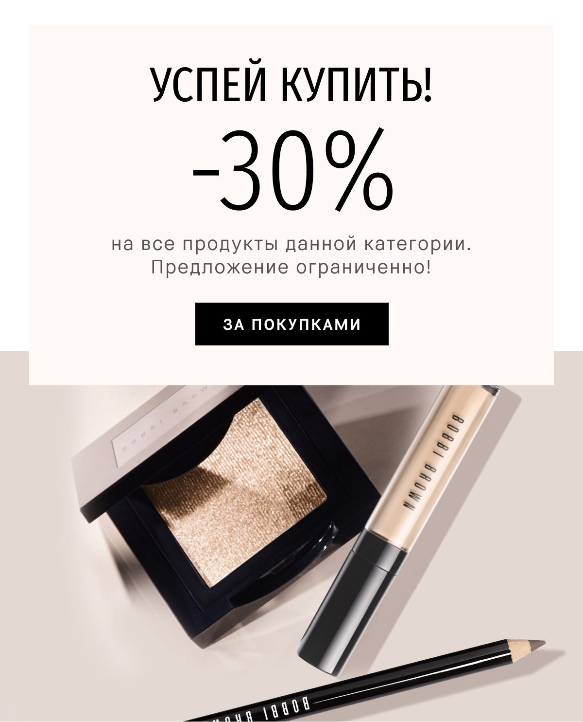 Условия акции: скидка -30% на выборочный ассортимент при покупке в интернет-магазине Bobbi Brown.Действие акции: с 09.07.2019 до тех пор, пока товары есть в наличии.