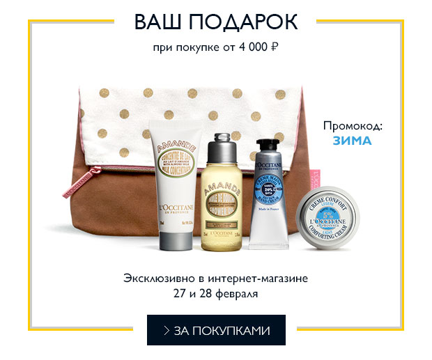 Условия акции: при заказе на сумму более 4000₽ в интернет-магазине вы получаете в подарок косметичку с миниатюрами бренда. Промокод: ЗИМАДействие акции: с 27.02.2018 по 28.02.2018Перейти к покупке!