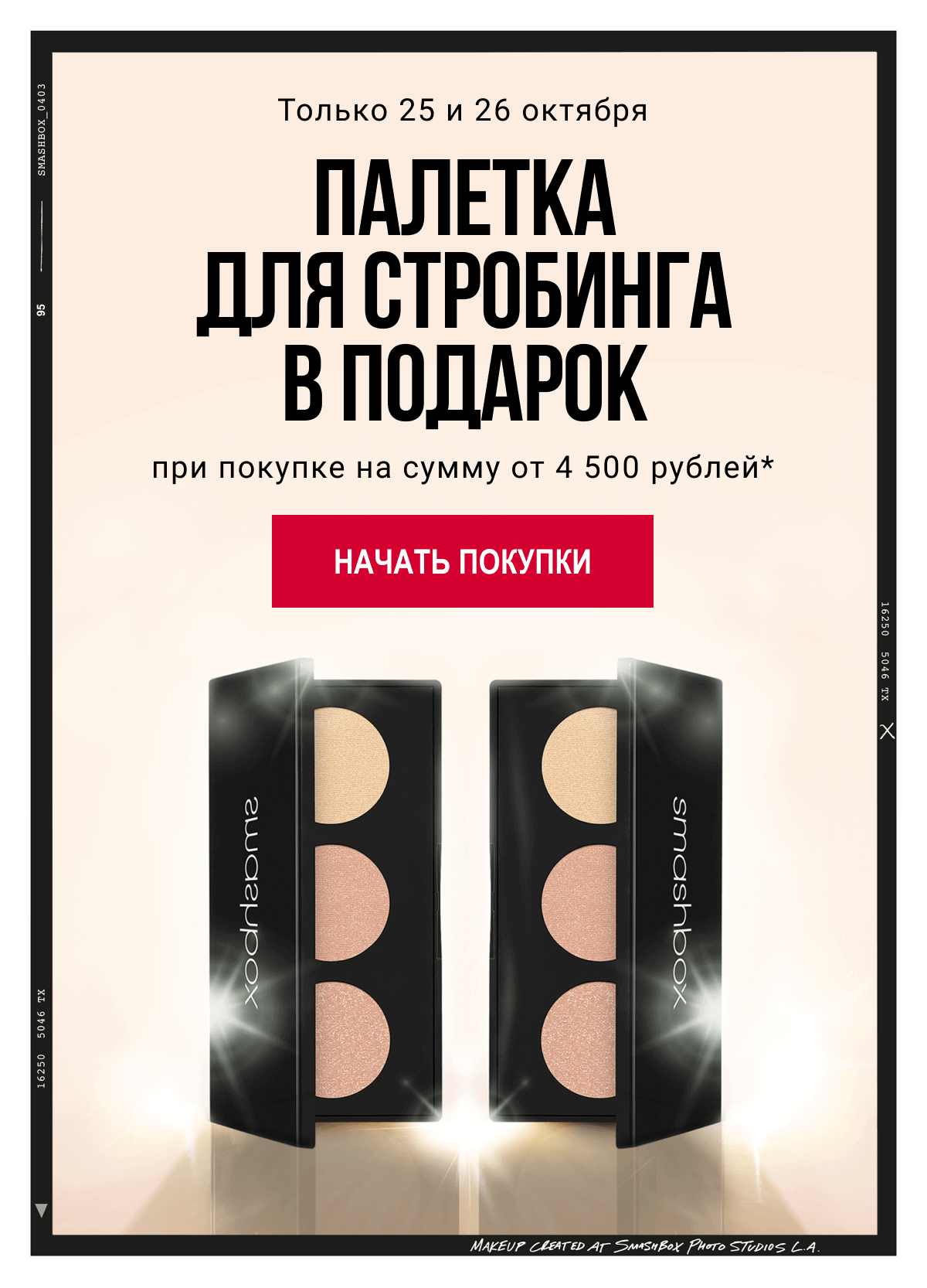 403 0 Условия акции: палетка для стробинга в подарок при покупке на сумму от 4500₽ в интернет-магазине Smashbox.Действие акции: с 25.10.2019 по 26.10.2019Перейти к покупке! 26.10.2019 Автор статьи: Мария Владимирова Поделиться с друзьями