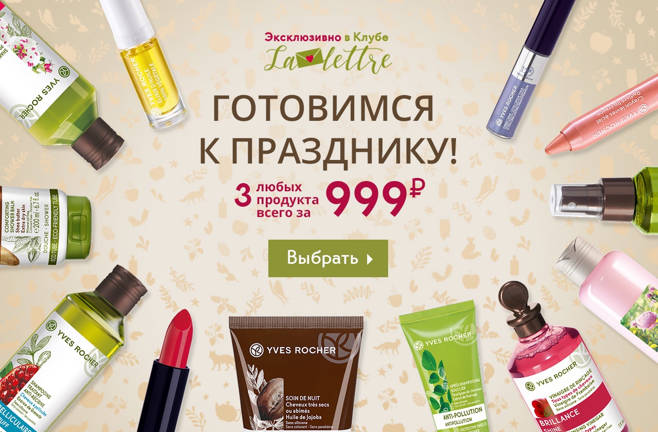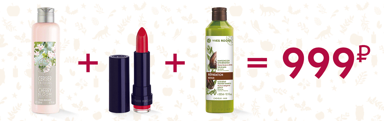 Предложение «3 любых продукта за 999₽» действительно до 9 декабря 2018 г., предложение «Калейдоскоп подарков» действительно до 6 января 2019 г. в интернет-бутике Yves Rocher.