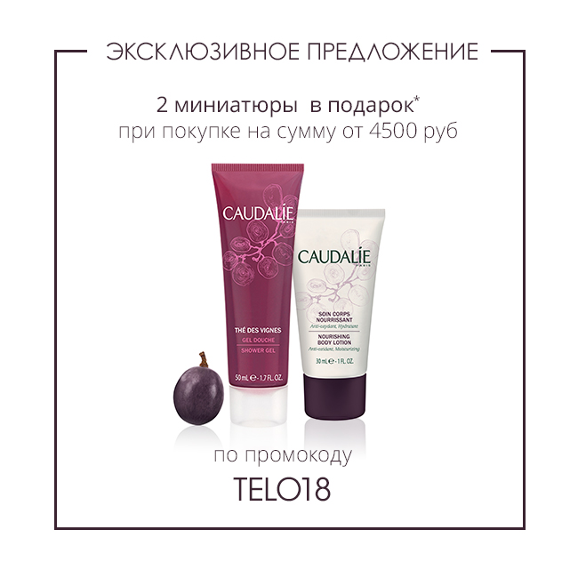 Питательный уход для тела (50 мл) и гель для душа «THE DES VIGNES» (50 мл) в подарок при покупке на сумму от 4500 руб. Акции не суммируются, количество ограничено наличием товара на складе. Акция действует до 04.06.2018