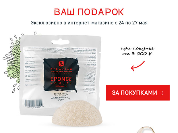 Условия акции: 1) при покупке на сумму от 3000 руб. в интернет-магазине Erborian в подарок вы получаете Спонж Конняку.2) при покупке на сумму от 6000 руб. в интернет-магазине Erborian в подарок вы получаете сумку и матирующий лосьон для сужения пор.Действие акции: с 24.05.2018 по 27.05.2018Перейти к покупкам!