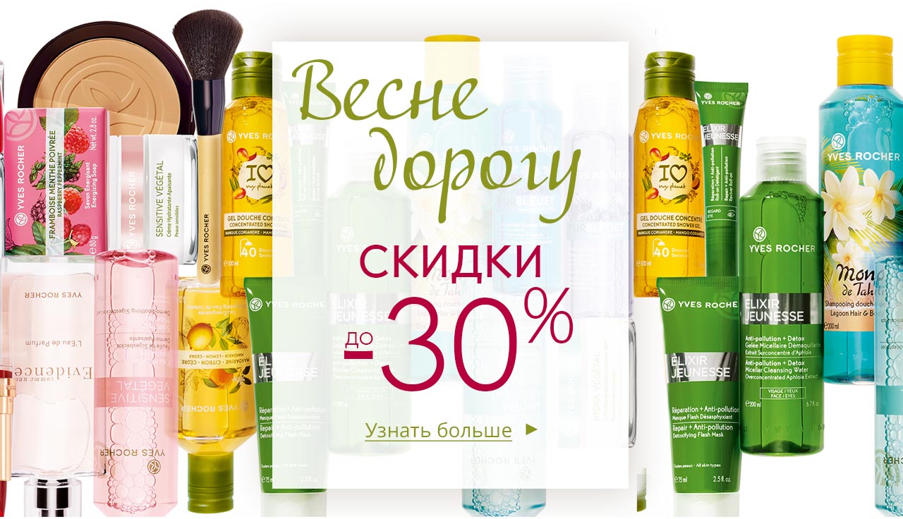 Предложение "Скидки до -30% на весенние продукты" действительно до 22 апреля, предложение "Набор "La Pure Beaute" в подарок за любой заказ" действительно 16-17 апреля в интернет-бутике