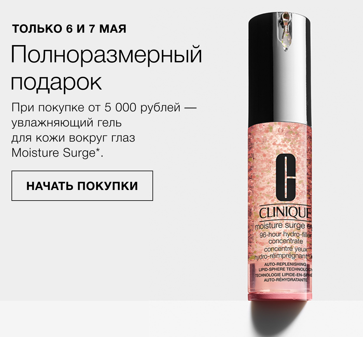 474 0 Условия акции: увлажняющий гель для кожи вокркуг глаз Moisture Surge в подарок при покупке на сумму от 5000₽ в интернет-магазине Clinique. Действие акции: с 06.05.2020 по 07.05.2020Перейти к покупке! 06.05.2020 Автор статьи: Мария Владимирова Поделиться с друзьями