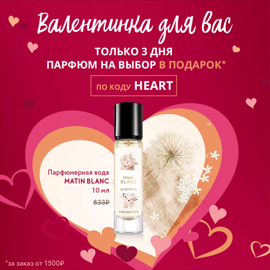Предложения «2=1» и «Парфюм на выбор в подарок по коду HEART» действительны до 16 февраля 2020 г., при покупке в интернет-магазине Yves Rocher.