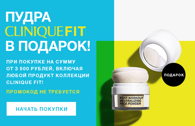 Условия акции: Пудра Clinique Fit в подарок при покупке от 3500₽ в интернет-магазине. Промокод не требуется. Действие акции: до тех пор пока есть в наличии. Перейти к покупке!