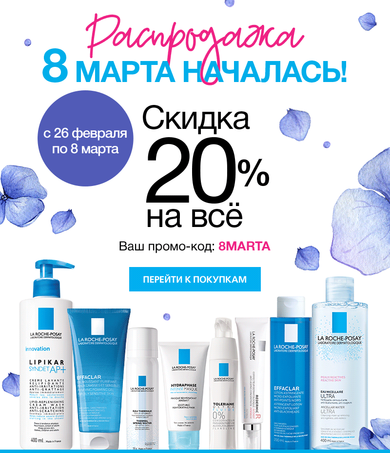 Условия акции: скидка -20% действует на весь ассортимент интернет-магазина La Roche-PosayПромокод: 8МАРТАДействие акции: 26.02.2018 по 08.03.2018Перейти к покупкам!