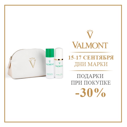 Условия акции: скидка -30% действует на продукцию бренда Valmont при покукпе в интернет-магазине Иль де Ботэ. Действие акции: с 15.09.2020 по 17.09.2020