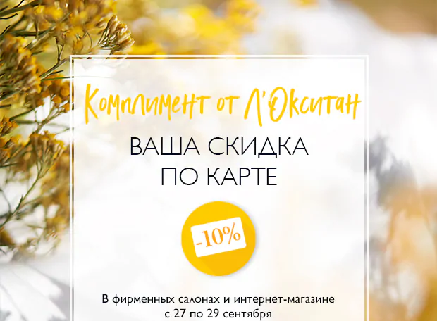 Условия акции: дополнительная скидка -10% к вашей карте действует в интернет-магазине L'Occitane.Действие акции: c 27.09.2019 по 29.09.2019