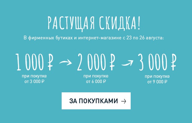 Условия акции: совершая покупки в интернет-магазине Erborian, действует растущая скидка:при покупке от 3000 рублей в подарок вы получаете скидку 1000 рублей;при покупке от 6000 рублей в подарок вы получаете скидку 2000 рублей;при покупке от 9000 рублей в подарок вы получаете скидку 3000 рублей.Действие акции: с 23.08.2018 по 26.08.2018Перейти к покупкам!