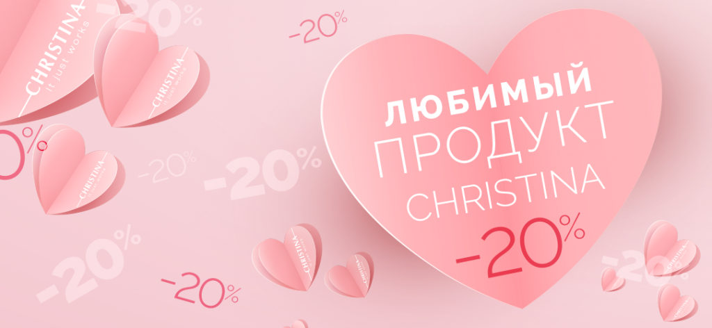 Условия акции: назначьте любимый продукт из списка ваших покупок в текущем заказе при покупке в интернет-магазине Christina. В течение следующих 14 дней вы получаете на него скидку 20%.Действие акции: c 01.09.2020 по 30.09.2020