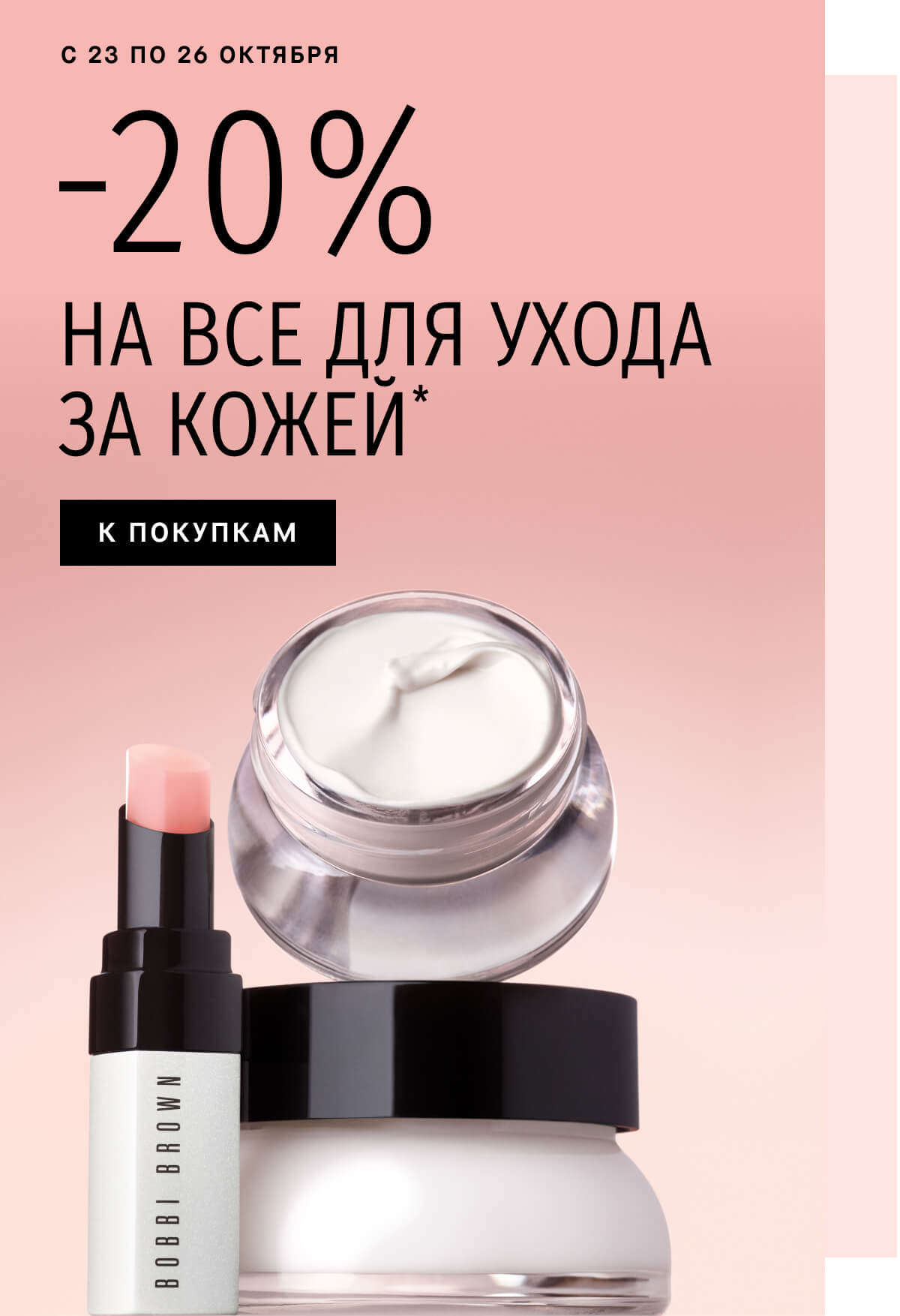 Условия акции: скидка -20% действует на все для ухода за кожей в интернет-магазине Bobbi Brown.Действие акции: c 23.10.2019 по 26.10.2019