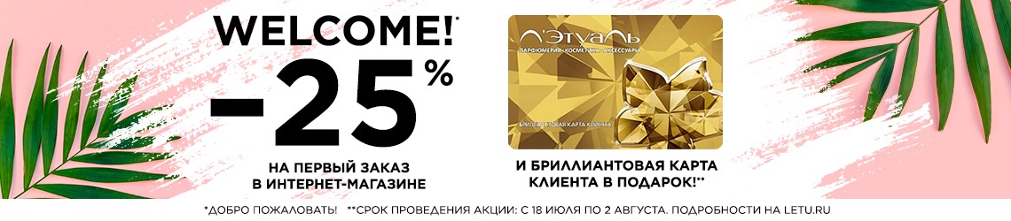 Условия акции: Бриллиантовая Карта клиента в подарок и скидка -25% на первую покупку на сумму от 1500₽ в интернет-магазине Л'Этуаль.Действие акции: с 18.07.2019 по 02.08.2019Подробнее об акции.