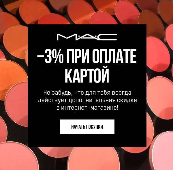 526 0 Условия акции: скидка -3% действует при оплате картой в интернет-магазине MAC.Действие акции: без указания срока.Перейти к покупкам! 04.08.2018 Автор статьи: Мария Владимирова Поделиться с друзьями
