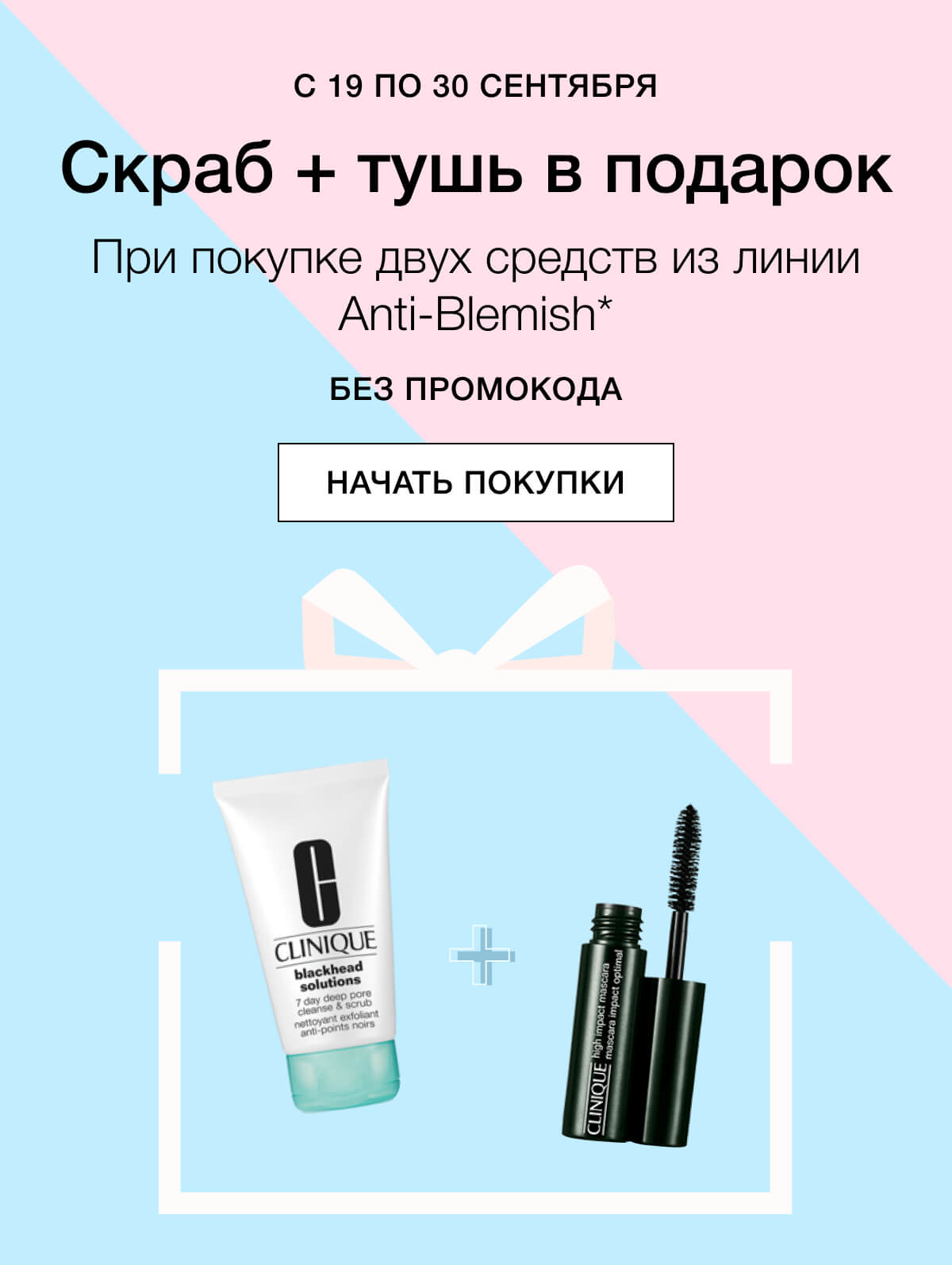 Условия акции: миниатюры скраба и туши в подарок при покупке двух средств из линии Anti-Blemish в интернет-магазине CLINQUE.Действие акции: с 19.09.2019 по 30.09.2019