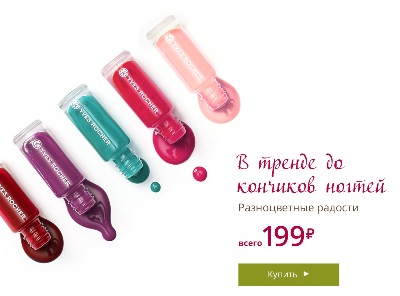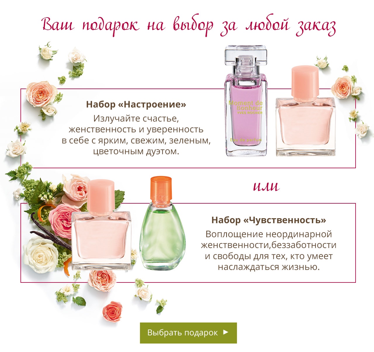Предложение «Набор из мини-парфюмов в подарок за любой заказ» действительно до 26 сентября 2018 г. в интернет-бутике Yves Rocher. Предложение «Продукты маникюра от 199₽» действительно до 30 сентября 2018 г. при заказе в интернет-бутике Yves Rocher.