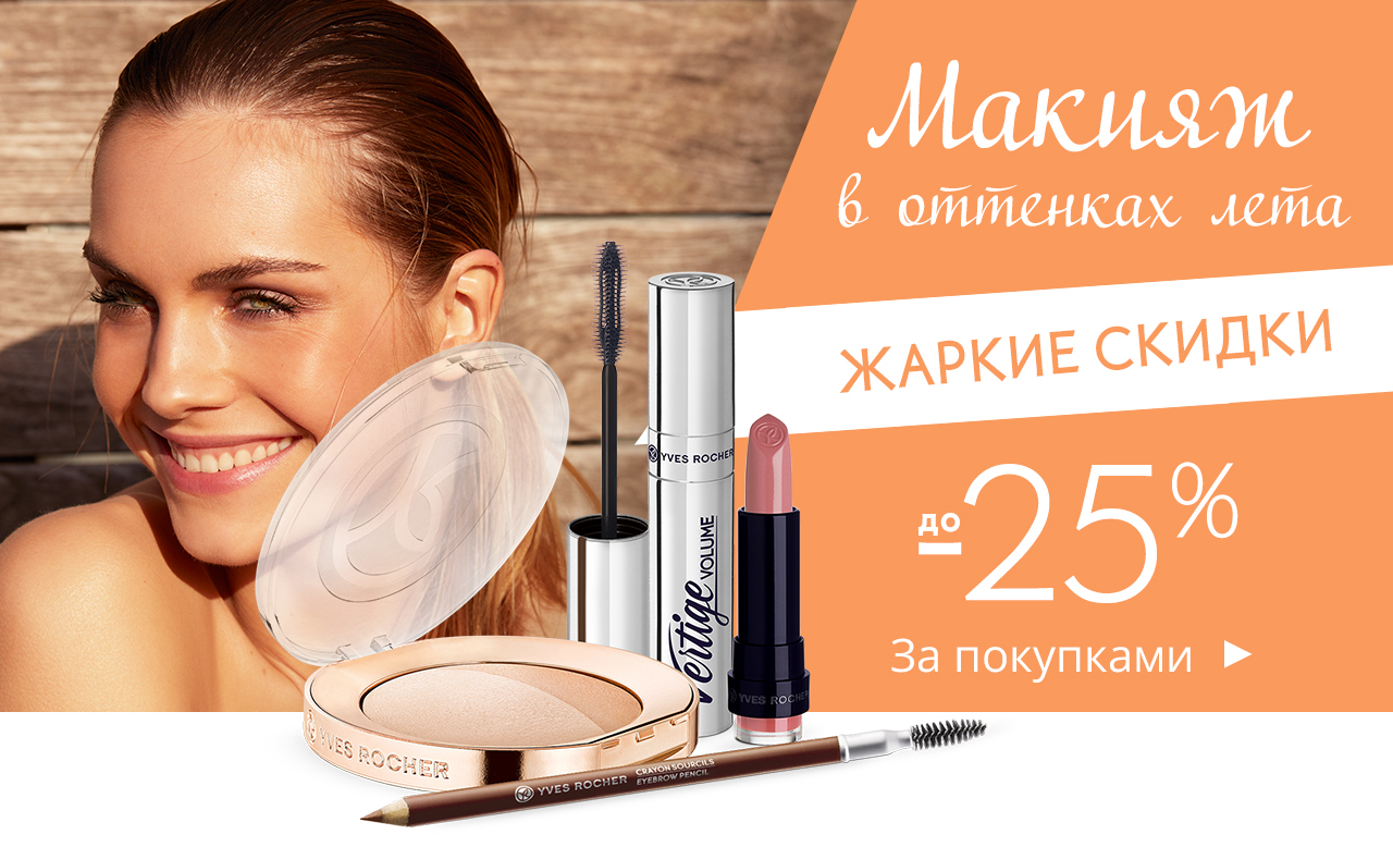 Предложение "Сумка в подарок за заказ от 2300₽" действительно до 3 августа 2018 г. при заказе в интернет-бутике Yves Rocher. Предложение "-25% на продукты макияжа" действительно до 12 августа 2018 г. в интернет-бутике Yves Rocher.