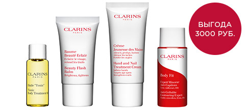 Условия акции:1) При покупке на сумму от 5000 рублей в интернет-магазине Clarins в подарок вы получаете набор миниатюр для тела.