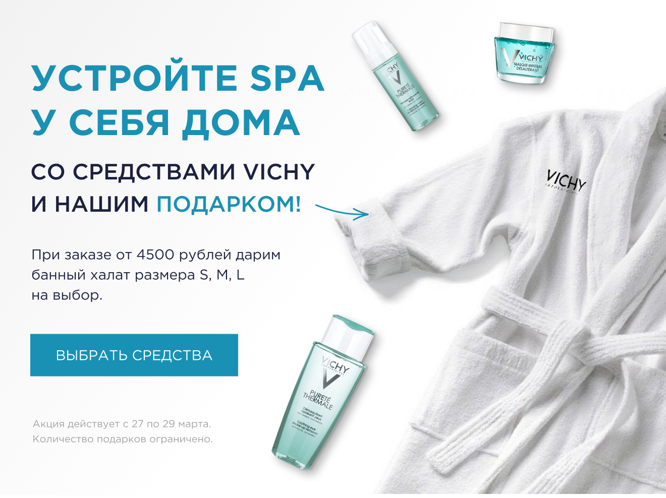 684 0 Условие акции: банный халат в подарок (размер на выбор S,M,L) при покупке от 4500 рублей в интернет-магазине VICHY. Промокод: RELAX Действие акции: с 27.03.2019 по 29.03.2019 Перейти к покупке! 03.04.2019 Автор статьи: Мария Владимирова Поделиться с друзьями