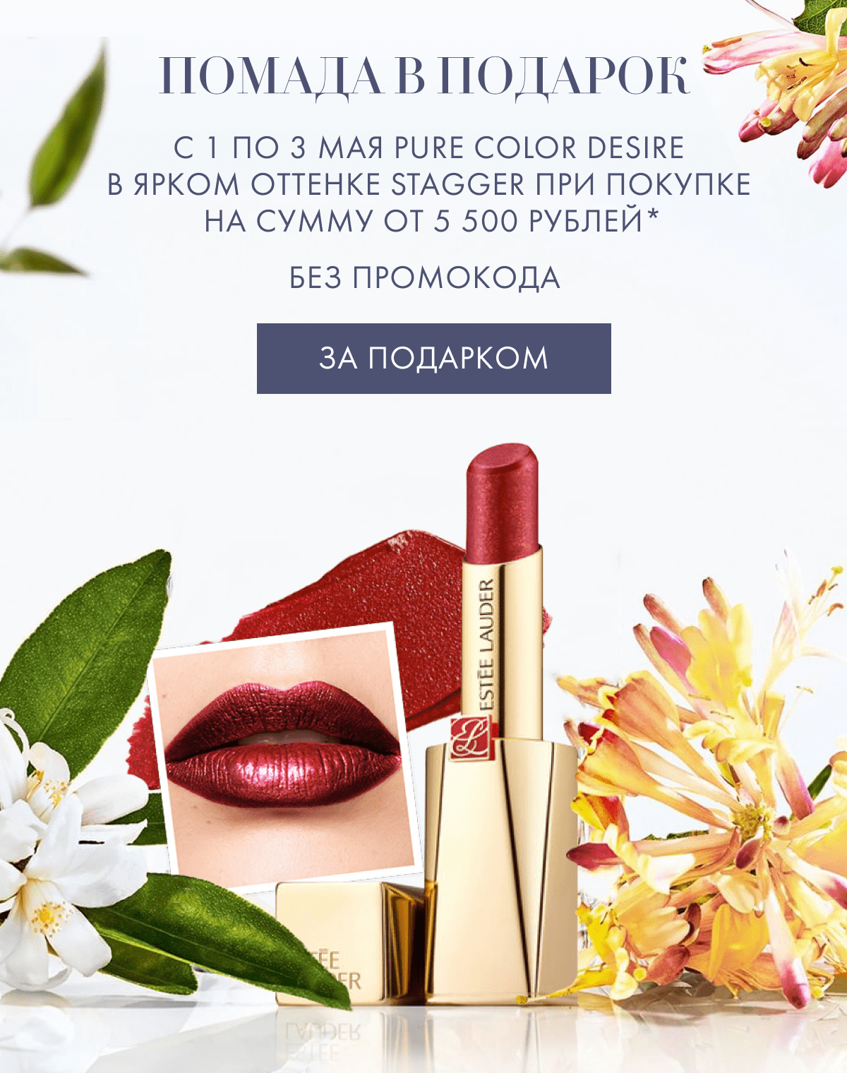 Условия акции: помада Pure Color Disire в оттенке Stagger в подарок при покупке на сумму от 5500₽ в интернет-магазине Estee Lauder.Действие акции: с 01.05.2020 по 03.05.2020