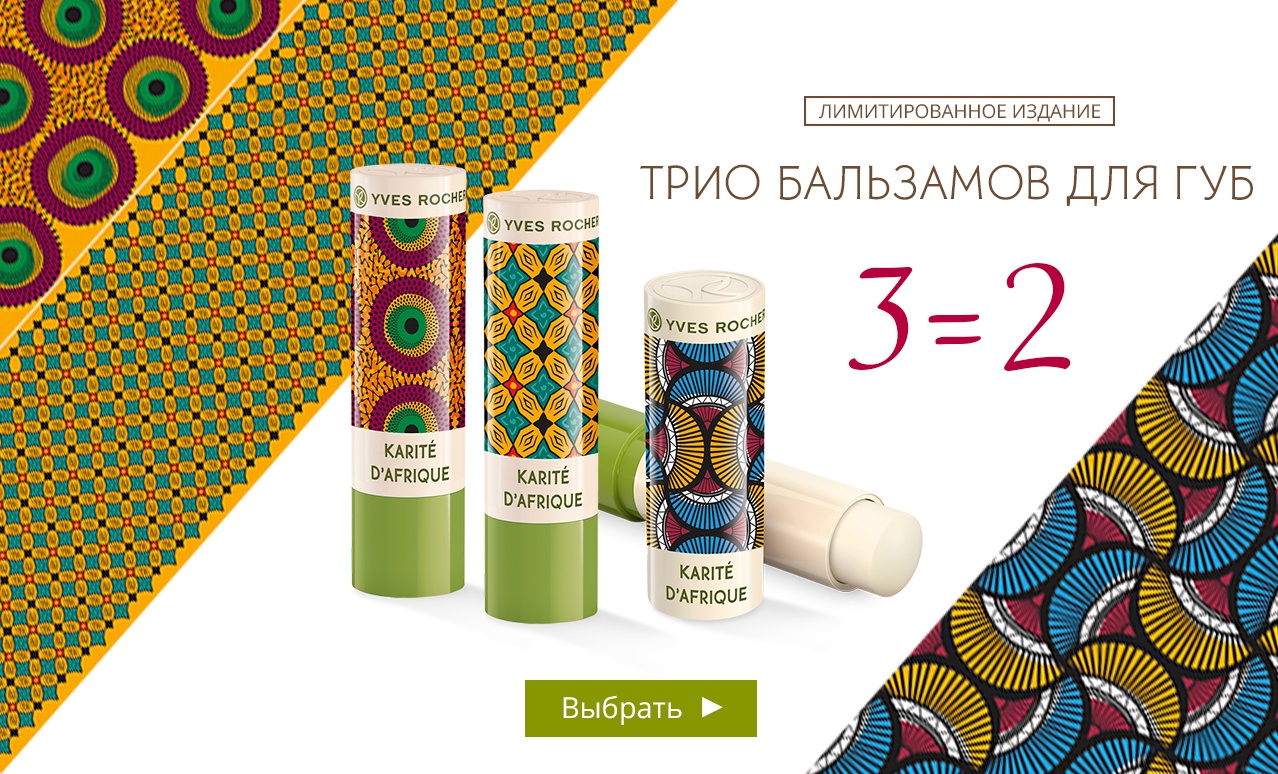 Предложение «Трио бальзамов для губ» действительно до 16 сентября 2018 г. при заказе в интернет-бутике Yves Rocher.