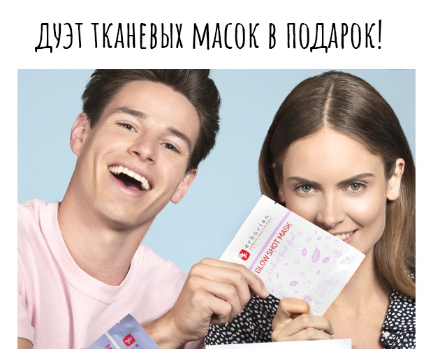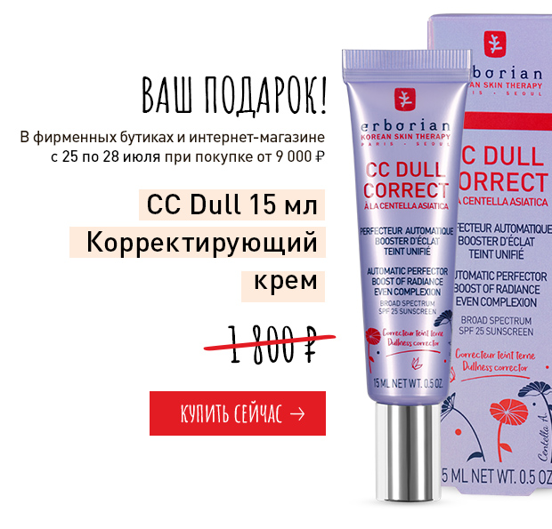 Условия акции: тканевые маски в подарок при покупке на сумму от 6000₽ и корректирующий крем CC Dull при покупке на сумму от 9000₽ в интернет-магазине Erborian.Действие акции: c 25.07.2019 по 28.07.2019