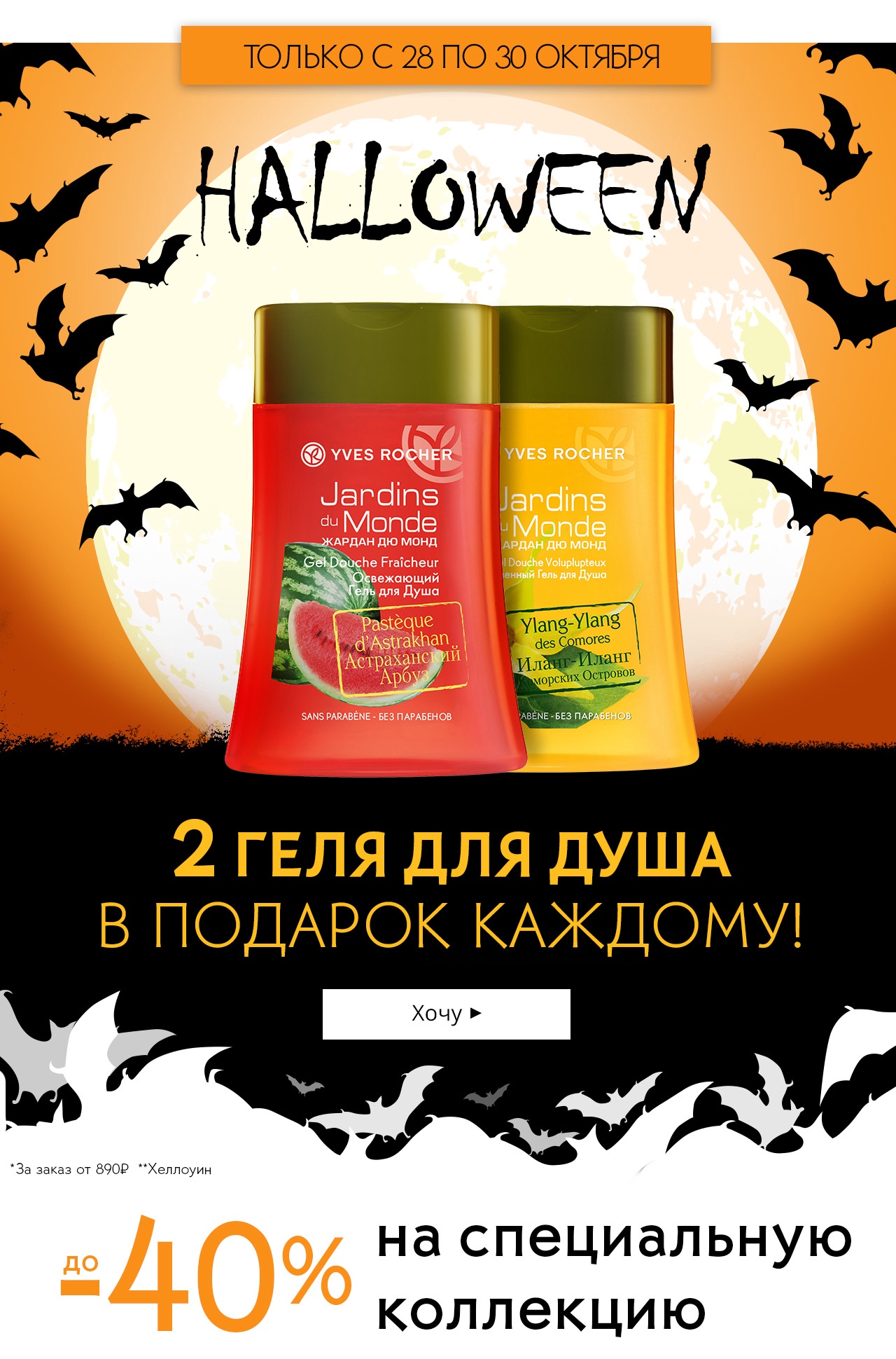 Предложения «2 геля для душа в подарок при заказе от 890 руб.» и «До -40% на специальную коллекцию» действительны до 30 октября 2019 г. в интернет-бутике Yves Rocher.