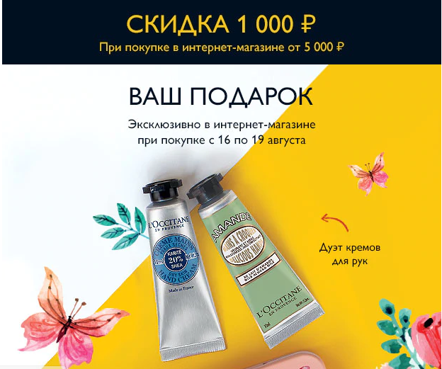 Условия акции: совершая покупку в интернет-магазине L'Occitane, в подарок вы получаете дуэт кремов для рук;при покупке на 5000₽ вы получаете скидку 1000₽.Действие акции: с 16.08.2018 по 19.08.2018