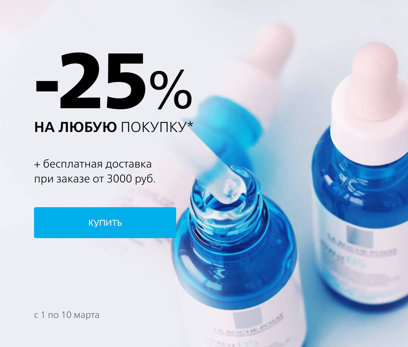 Условия акции: скидка -25% на любой заказ и бесплатная доставка при покупке на сумму от 3000₽ в интернет-магазине La Roche-Posay.Промокод: SUNДействие акции: с 01.03.2020 по 10.03.2020