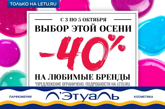 Условия акции: скидки до -40% действуют на определенные бренды в интернет-магазине Л'Этуаль.Действие акции: с 03.10.2018 по 05.10.2018Подробнее об акции.