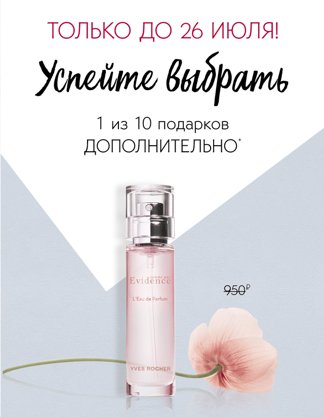 Условия акции: предложение "Дополнительный продукт на выбор в подарок" действительно при покупке в интернет-магазине Yves Rocher. Действие акции: с 24.07.2020 по 26.07.2020